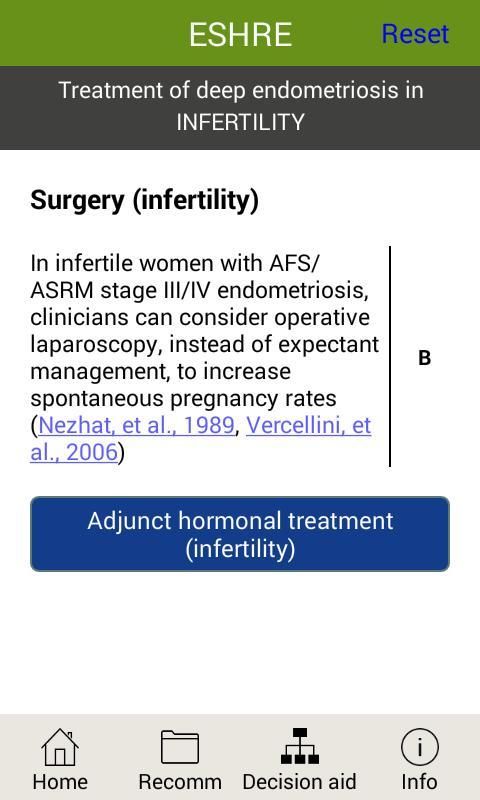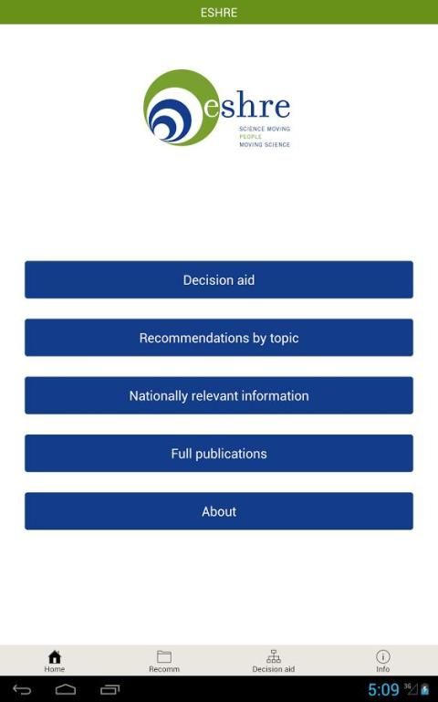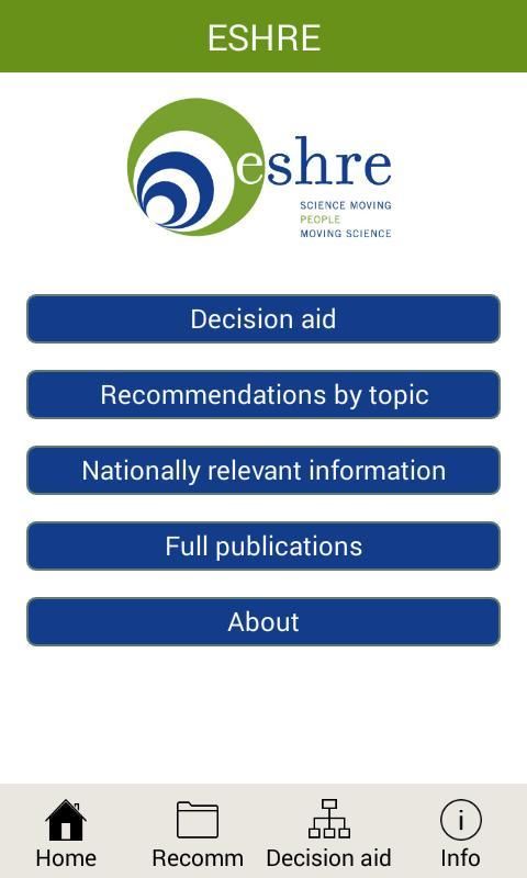 وقد نشرت الجمعية الأوروبية للتناسل البشري وعلم الأجنة (ESHRE) هذا التطبيق لضمان التنفيذ السلس والسهل من لالتوجيهي "إدارة النساء مع بطانة الرحم" في الممارسة السريرية. إلى جانب المحتوى التوجيهي كاملة، والتطبيق يحتوي على المساعدات القرار الذي يوجه المستخدم إلى المشورة الأمثل في مجموعة واسعة من الحالات السريرية. معلومات خلفية واسعة، بما في ذلك مكتبة الصور، يتم تضمين. هذا التطبيق هو صالح الحصري لعضوية ESHRE.
