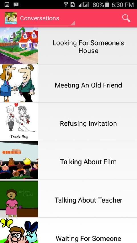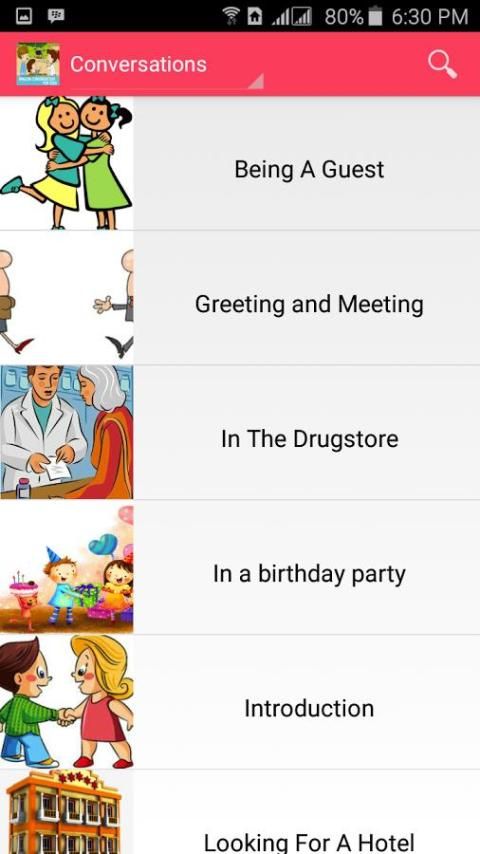 يحتوي هذا التطبيق أمثلة مختلفة من الانجليزية محادثة اليومية. مناسبة جدا لأولئك الذين يرغبون في تعلم التحدث باللغة الانجليزية. يمكن للأطفال ممارسة اللغة الإنجليزية مع موضوعات جيدة والحياة الحقيقية.