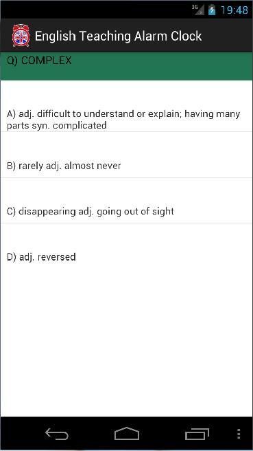 هذا هو المنبه الذي يدرس اللغة الإنجليزية، وعندما صوت التنبيه لديك للرد على السؤال الإنجليزية من أجل وقف alarm.After تجد الإجابة الصحيحة في اختبار، سؤال، وسوف ردها apperar كما إعلام.