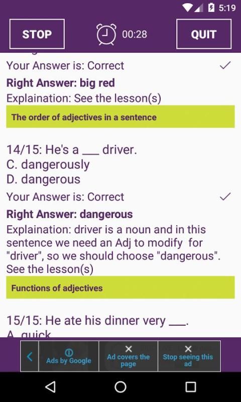 عندما قمت بخطأ التطبيق يشرح لك لماذا كانت إجابتك غير صحيحة. سوف تفسيرات بسيطة تساعدك على مراجعة المعلومات حول تفاصيل النحوي.