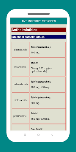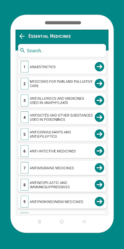 تشمل الأدوية الأساسية احتياجات الطب لنظام الرعاية الصحية الأساسي. سرد الأدوية الأكثر فعالية وآمنة وفعالة من حيث التكلفة لظروف الأولوية.يتم اختيار شروط الأولوية على أساس أهمية الصحة العامة الحالية والمقدرة ، وإمكانية العلاج الآمن والفعال من حيث التكلفة. يحتوي هذا التطبيق على الأدوية التالية مع شرحها.