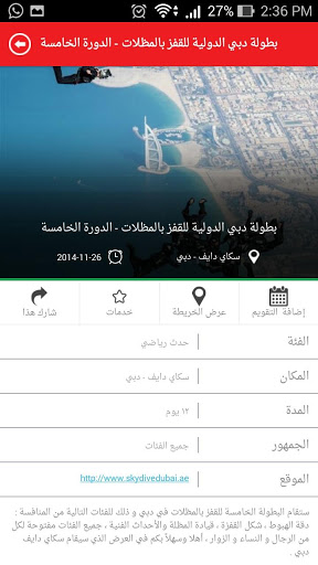 مختلف الخدمات و منها ( وقت الفعالية - بيانات الفعالية - مدة الفعالية - مكان الفعالية - خريطة للوصول الي موقع الفعالية من اي مكان - الخدمات التي تقدمها الفعالية للجمهور من عيادات و مكاتب الشرطة و المفقودات و المعثورات و مواقف السيارات و مواقف سيارات الاجرة - مواقف الحافلات - محطات المترو ، و كل ذلك في خريطة توضيحية لموقع الفعالية )