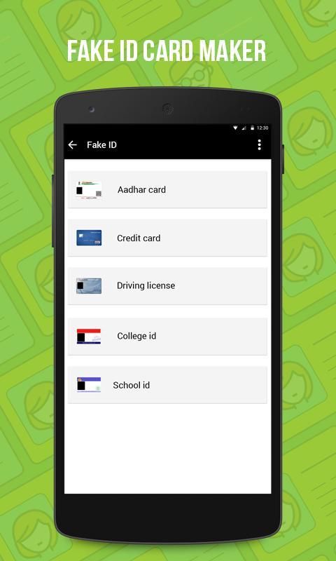 مولد هوية مزورة هو سهل جدا للاستخدام التطبيق. ومن 1 يأخذك من خلال عملية حيث يطلب منك ل1 حدد نوع المعرف الذي تريد أن تولد. الاختيار من بين أكثر 5 معرفات وهمية، وهمية بطاقة Aadhar، بطاقة وهمية الائتمان، والسائقين وهمية الترخيص، معرف مدرسة وهمية وهمية كلية الهوية. لهم كامل في التفاصيل التي تريد أن يكون على رقم الذي اخترته، وتوليد هوية وهمية.
