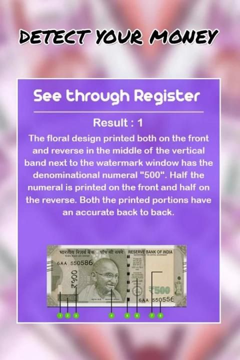 كشف عن المال وهمية تحتوي على معلومات عن كيفية كشف العملة المزيفة. تطبيق يحتوي اليدوي لمعرفة النقاط المهمة في معرفة هذه المذكرة وهمية.