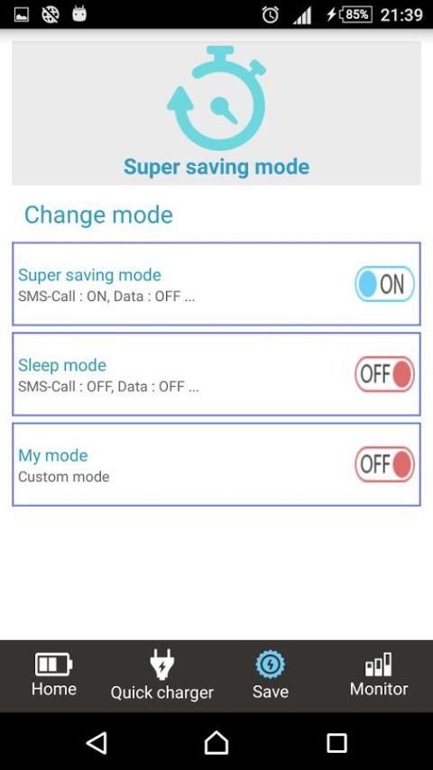 بمجرد توصيل الجهاز بمصدر طاقة، فإن تطبيق الاتصال تلقائيا إلى نظام شحن للاختيار من بينها وذلك لتوفير الوقت الشحن. يمكنك اختيار تمكين أو تعطيل واي فاي، جي بي آر إس، 3G، زيادة أو تقليل درجة سطوع الشاشة، وتقنية بلوتوث، وآلية نفسها من التطبيقات ... لتوفير الوقت شحن تصل إلى 60٪. لتوفير الوقت، يمكنك اختيار الشحن السريع خيارات الوضع التي تم تثبيتها.