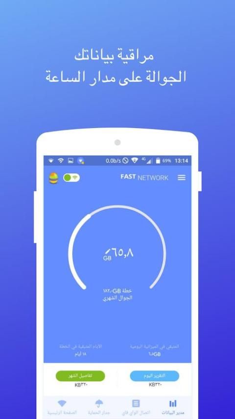 مراقبة استخدام بياناتك الجوالة على مدار الساعة وعرض المعلومات بدقة على الفور. إرسال تنبيه إليك عند وجود تطبيقات تهدر البيانات أو تقترب من حدود بياناتك.