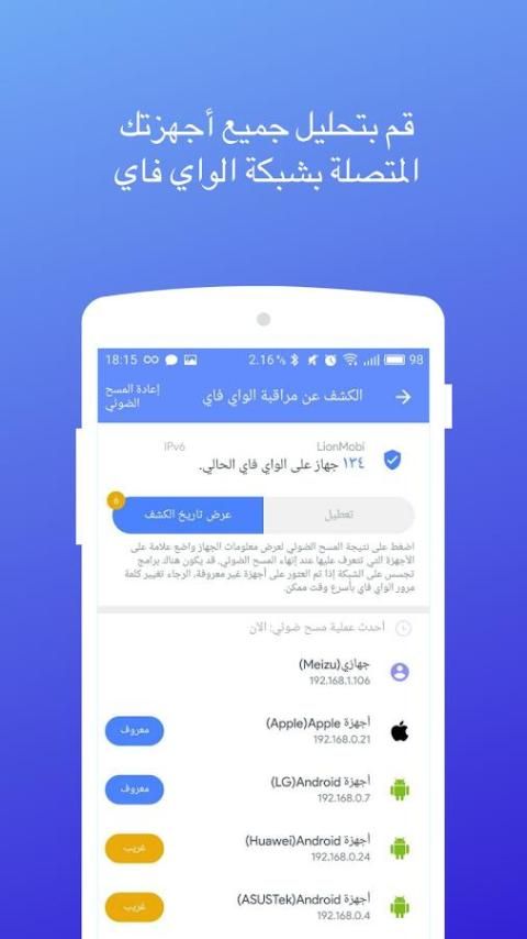 راقب جميع الأجهزة الموصلة على النقطة الفعالة لشبكة الواي فاي، بما في ذلك هاتف Android، وجهاز iPhone/iPad، وأجهزة الكمبيوتر/اللابتوب التي تعمل بنظام الويندوز. يمكنك تقييم مستويات الأمان، واكتشاف الدخلاء وتحليل مشكلات الشبكة.
