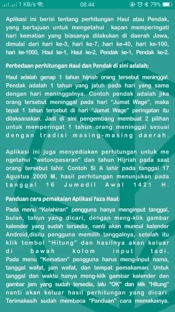 Aplikasi Faza Haul ini berisi tentang perhitungan Haul dan Pendak, yang bertujuan untuk mengetahui kapan memperingati hari kematian yang biasanya dilakukan di daerah Jawa, dimulai dari hari ke-3, hari ke-7, hari ke-40, hari ke-100, hari ke-1000, Haul ke-1, Haul ke-2, Pendak ke-1, Pendak ke-2.