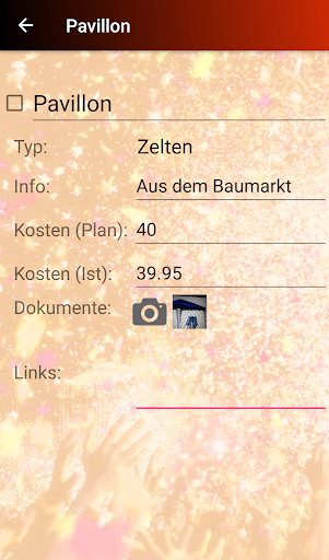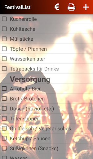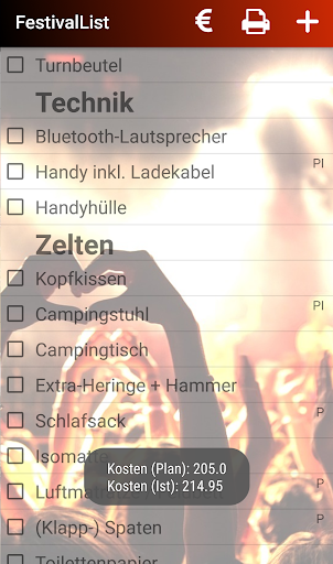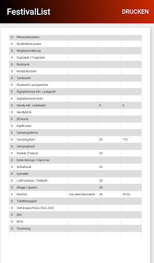 A predifined packing list shows you all the stuff like cloths, BBQ equipment, tickets etc. you will need for camping and partying. Of course, you can complete this list with your own stuff.