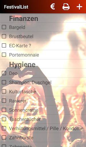 With this universal festival packing list you've got all important things for your next festival in one app. So you won't lose the focus on the important things and costs and can concentrate on partying.