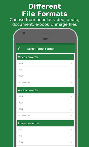 تحويل الملفات من العديد من التنسيقات المختلفة إلى تنسيقات الملفات الأكثر شيوعا مع هذا التطبيق المجاني. يمكنك تحويل الفيديو، الصوت، المستند، الكتاب الاليكتروني، العرض التقديمي، الصورة، وحتى ملفات الأرشيف - بسهولة وخالية مجانا. كل ما تحتاجه هو اتصال بالإنترنت.