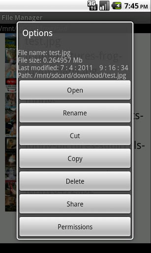 Simple, easy and powerful file managerEasy and powerful file manager to keep your files in order.Features: Rename Cut file and folder Copy file and folder Delete file and folder Share files via dropbox, email etc Permissions readable and writable open filessupports jpg, jpeg, png, gif Build in picture viewer txt, java, conf, xml, cfg, fstab,sh, gz, bks, zip, rc, prop, so, axf Build in text viewer3gp mp4, avi open default video viewerapk installs fileKeywords: file, files, browser, filebrowser, filemanager,explorer, fileexplorer, share, delete, copy, cut, rename, viewer, fileviewer