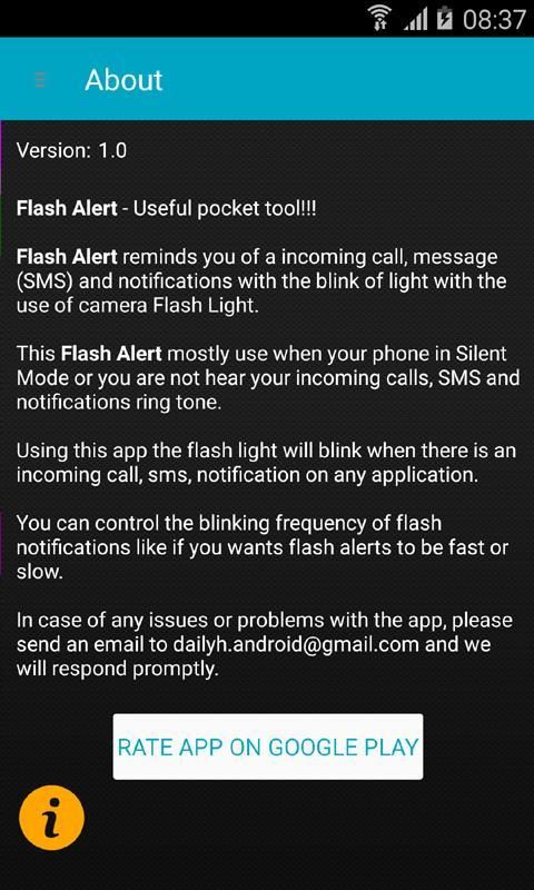 فلاش تنبيه تطبيق مفيد جدا في الظلام أو في الليل عندما كنت لا تريد أن تسمع نغمات. والتنبيه فلاش جزءا لا يتجزأ من الجهاز وميض على الفور كما أن الهاتف يرن أو استقبال الرسائل القصيرة أو أي إشعار. فلاش ينبه تطبيق تخطر مع ضوء وامض الكاميرا عندما يكون لديك مكالمة أو الرسائل القصيرة. تطبيق فلاش تنبيه تستخدم عندما يكون لديك لا سماع النغمات الخاصة.