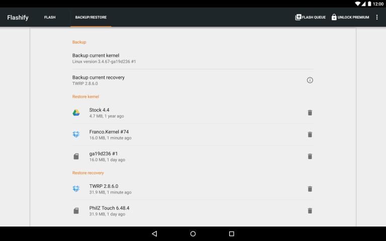 6 - Backup/Restore kernel and recovery using Sdcard or cloud (Dropbox, Box (premium) or Google Drive (premium)).