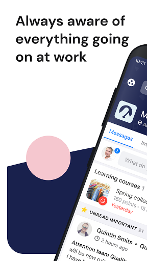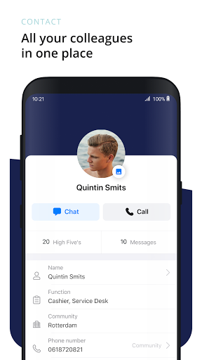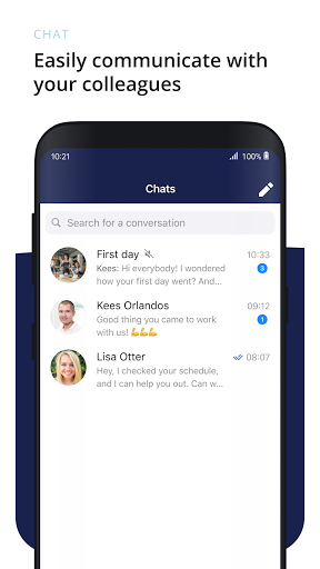 داخل المنصة، سيكون لديك حق الوصول إلى المعلومات ذات الصلة في الجدول الزمني الخاص بك. في هذا المجال، يمكنك الاستجابة للرسائل الواردة ومشاركة الأفكار والإجابة على الأسئلة. تتيح لك وظيفة الدردشة بسرعة وسهولة الاتصال بزملائك. سواء كانت دردشة خاصة أو دردشة جماعية، لا يهم. ابق دائما على اتصال مع فريقك وزميلك في العمل. في التطبيق، لديك دائما نظرة عامة واضحة عن زملائك وتفاصيل الاتصال الفعلي الخاصة بهم.