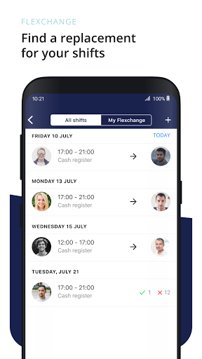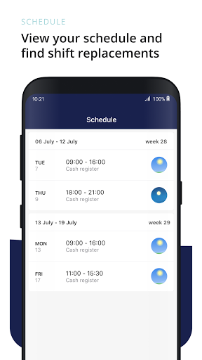 لا تختبط أبدا حول تحول عملك التالي مرة أخرى! من خلال دمج جدول عملك، يمكنك رؤية ساعات العمل القادمة والعثور على بديل كلما لم تكن متاحا.
