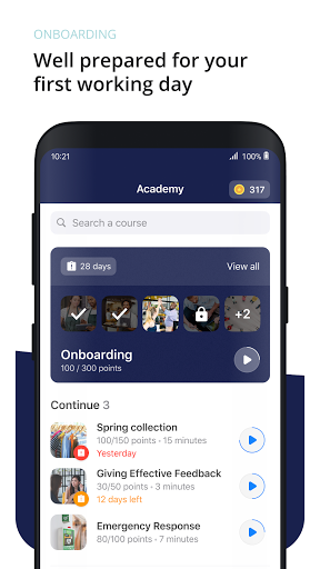 اصنع زملاء جدد يشعرون بالمنزل مباشرة مع وحدة Onboarding. هنا يمكنهم التعرف على الشركة ومعلومات العمل المحددة، مثل قيم الشركة، مقدمة للفريق، وأي معلومات ضرورية لوظيفتها الجديدة. لجعل أكثر متعة بالنسبة لك، يمكن لمديريك إثراء التدريب الخاص بك مع مقاطع الفيديو والصور والمسابقات.