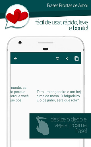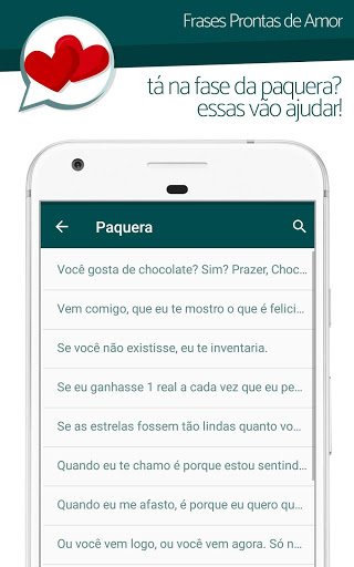 Os temas e categorias estão todos bem divididos para ficar fácil de você encontrar sua frase de amor, indireta, cantada ou xaveco prontinha para ser enviada, além disso frases novas vão sempre ser adicionadas, assim as frases vão estar sempre novas e exclusivas!