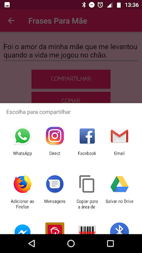 Envie direto via Whatsapp, SMS ou Email, o Frases para Mãe possibilita você compartilhar com os mais diversos aplicativos de mensagens, além de poder copiar sua frase para área de transferência.