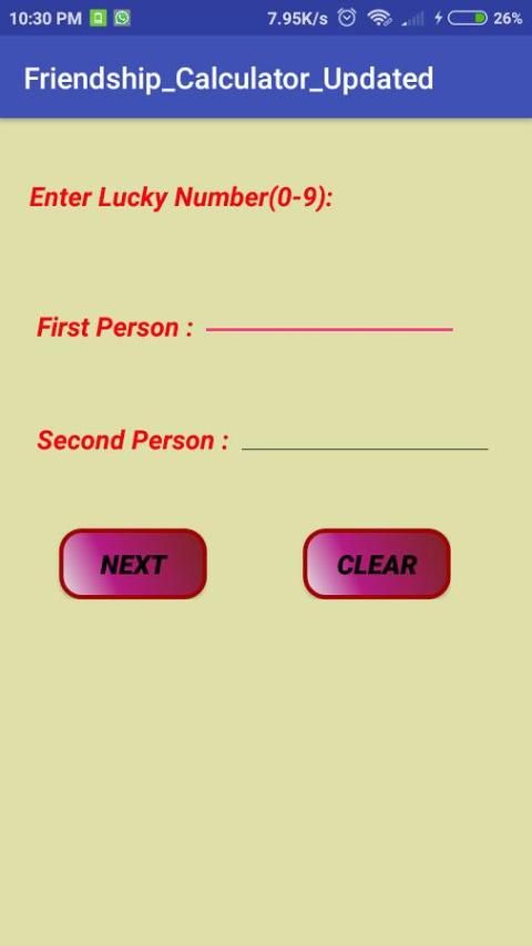 أولا الحاسبة سوف تحقق في أسماء والشهر عيد ميلاد، باستخدام المنطق سوف يستغرق إلى الصفحة التالية أو عرض النتيجة. إلا فإنه سوف تحقق من أرقام الحظ، ثم مكان مفضل والمعتقد في الحب أم لا. وبناء على ذلك سيتم عرض الصداقة في النسبة المئوية. بعد كل سؤال يولد نسبة واستخدام المنطق فإنه يعرض الصداقة.