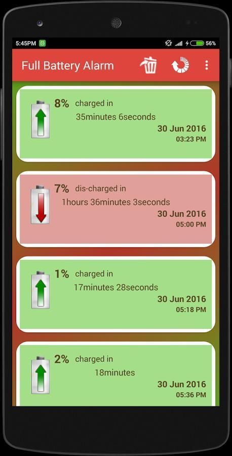 > هذا التطبيق، ويوفر البطارية كاملة إنذار الذكية تاريخ وضع بطارية الهاتف المحمول ل. فإنه يدل على تهمة والتفريغ وقت البطارية، وسوف تظهر كافة السجلات من حالة البطارية. هذا التطبيق لديه أجهزة الإنذار الصوتية مخصص أيضا يعرض الإخطار عن حالة البطارية.