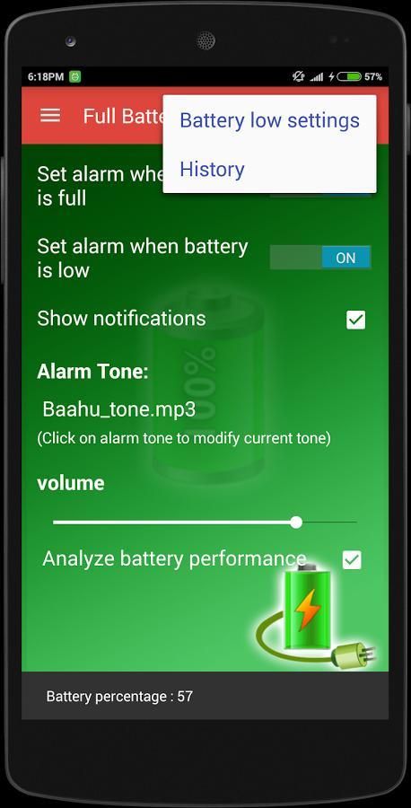 > كما أنها سوف تبقي لكم تحديث على حالة شحن البطارية من خلال الإعلام. كامل البطارية الذكية إنذار هو أفضل مدافع البطارية من خلال حماية ضد الرسوم المفرطة وهناك من ينقذ حياة البطارية. ببساطة تثبيت هذا التطبيق في هاتفك المحمول وتشغيل التطبيق. فإنه سيتم تلقائيا صوت تنبيه مرة واحدة وسوف يتم شحن البطارية بالكامل أو منخفضة للغاية. لكنه يظهر أيضا تاريخ من حالة البطارية وسيتم عرض إخطار من حالة البطارية.