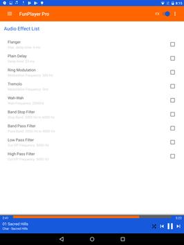 In addition, the music player allows you to apply a large variety of audio effects (Delay, Flanger, Wah-Wah,...) and various digital filters (High Pass, Low Pass, Band Pass, ...) to any kind of music. These audio effects and filters can arbitrarily be combined.