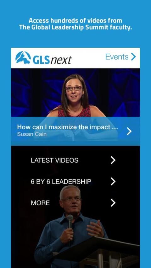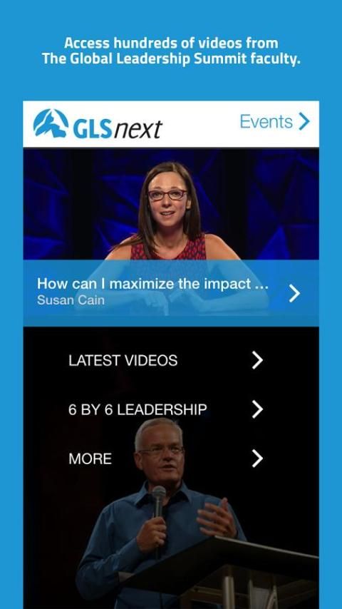 The official GLSnext app for android presents videos from a world-class faculty including Bill Hybels, Susan Cain, Patrick Lencioni, Joseph Grenny, Wilfredo De Jesus, and Dr. Henry Cloud. Find hundreds of Global Leadership Summit videos (with more added each week).