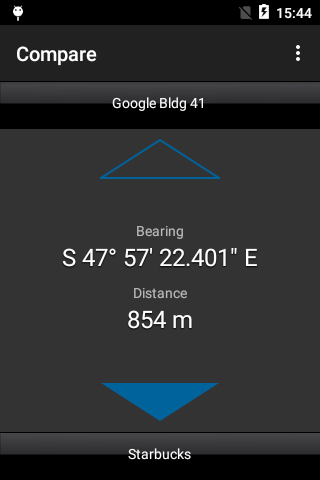 The Compare function requires at least two saved locations. From the Compare screen select the locations in the top and bottom lists. The distance and bearing between them will be shown between the two arrow panels. Press either arrow to determine the direction - the active arrow points in the direction of the bearing.