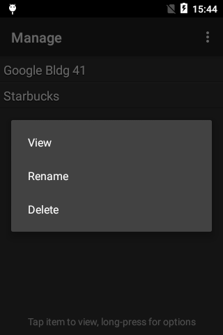 Use the Manage function to view, rename or delete saved locations. In the list press a location to view its details or long-press to select View, Rename or Delete. Access the menu to export the saved locations to a KML file. An SD card or similar external storage is required.