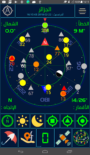 1 - مواقع الأقمار الصناعية في السماء بالنسبة إلي موقعك موضحة علي بوصلة بأشكال مختلفة ( GPS بشكل دائرة , GLONASS بشكل مثلث . و أشكال أخرى لي الأقمار الصناعية الأخرى ... ) ,