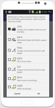 Deep scan heuristically scans for and recovers the following types of files: BMP, JPEG/JPG, PNG, MNG, JNG, GIF, MP4, AVI, MKV, MP3, OGG, OGM, WAV, FLAC, AMR, MP4A, PDF, SXD, SXI, SXC, SXW, ODT, ODG, ODS, ODP, DOCX, XLSX, PPTX, ZIP, JAR, APK, EPUB.