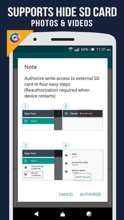 ► بطاقة SD يدعم: معرض قفل يدعم ملف الجلود من بطاقة SD أيضا على فوق أجهزة المصاصة. لأجهزة أندرويد 5.0+ تمكين SD بطاقة الوصول للكتابة لإخفاء صور بطاقة SD والفيديو.