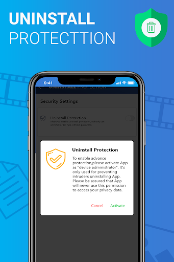 Uninstall protection is another feature which make it more secure. Hide photos, videos & File is specially design for people to have secure place in mobile to hide it private picture, video & any other document freely.