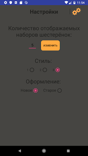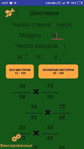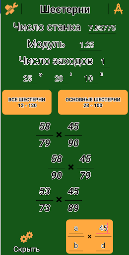 The application searches for the number of gear teeth on a gear hobbing machine (differential guitar), based on the specified values ​​(machine number, module, number of teeth, angle) and displays sets of four gears in order of accuracy in a convenient form (the most accurate from above).