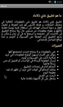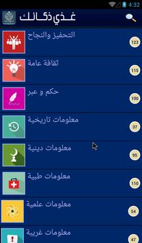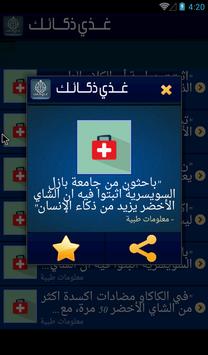 ثقف نفسك مع تطبيق غذي ذكاءك يتوفر على معلومات عامة و ثقافة عامة و هل تعلم و الذكاء في مختلف المجالات، و الهدف الأسمى لغذي ذكاءك هو نشر المعرفة و العلوم و ثقافة عامة و معلومات هل تعلم لتنمية ذكاء العقل و دعوة أصحاب الهواتف إلى استغلال فترة يومية لتغذية ذكاء عقولهم بمعلومات ثقافة عامة و علمية و طبية و تاريخية و دينية و أيضا للتنمية الذاتية. و هل تعلم أنه لا يحتاج غذي ذكاءك إلى الانترنت لكي تتصفحه و تستمتع به في أي زمان و مكان. و يدعم التطبيق نشر المعرفة و ما تيسر من ثقافة عامة و معلومات عامة على الفيسبوك و التويتر و عدة مواقع للتواصل الإجتماعي. و أنت جالس في أي مكان بدون انترنت ثقف نفسك بفتح التطبيق و ولوج كل الأقسام و سوف تستمتع و أنت تفرأ المعلومات و ترفع الذكاء الخاص بك. ذكاء عقلك يعتمد على تشغيله باستمرار و لإثراء مخزونه المعرفي. ثقف نفسك لتعلوا فوق الجميع برجاحة عقلك و الذكاء الذي تتميز به و إضافة ثقافة عامة لذهنك.