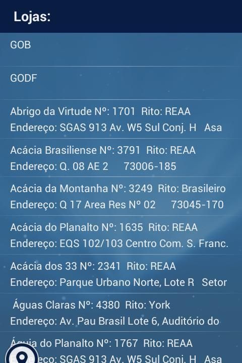 Aplicativo exclusivo para uso entre fraternos, afim de encontrar lojas maçônicas mais próximas da sua localização atual e informações das lojas. Contém informações da página do Facebook de cada oriente. Calendário de festividades. Fotos de lojas e de festividades. Informações de lojas, como seu endereço e localização, sua logo, seu V.M., dias de lojas e qual o rito, telefone, e-mail ou site.