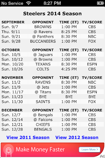 Go Steelers! stores and displays the schedule and scores for the Pittsburgh Steelers football team.