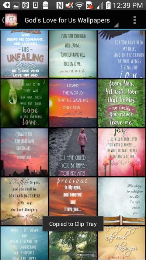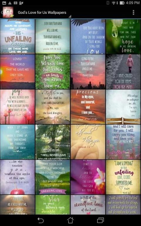 التطبيق خلفية المسيحي الوحيد الذي يركز على الكتاب الذي يتصل محبة الله لنا. لمجرد لحظة، الانغلاق على العالم، ويشعر أي شيء ولكن محبة الله في الكتاب المقدس. ويدويا بعناية فائقة اختيار آيات الكتاب المقدس من الإصدارات يقول:، نلت، ESV، HCSB والوطنية للعلوم الكتاب المقدس. عندما تجد خلفية أن يتحدث إلى قلبك أكثر، اختره كخلفية الشخصية.
