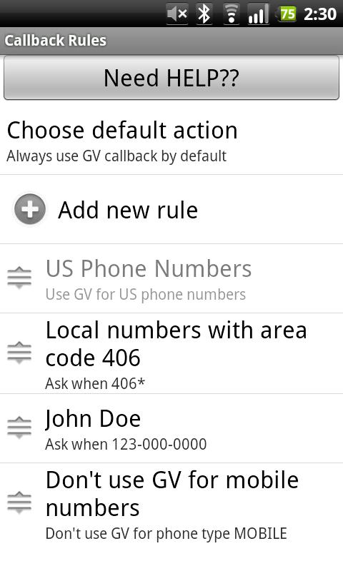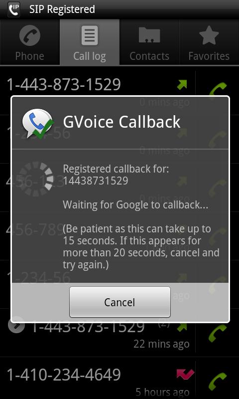 This app detects your outgoing call, and uses Google Voice (GV) to call you back and connect you to the call.With appropriate setup, Google Voice Callback can help you to get free outgoing calls. HOWEVER, you do NOT get free calls just by installing this app. Read the FAQ on what else you need to do. Detailed controls giving YOU the flexibility and power to choose when and for which numbers to use callback with Google Voice. Google Voice Callback can be combined with Gizmo5/Sipdroid/Fring/Sipgate or other voip solutions to make free calls over wifi or 3G.If you use multiple callback number in Google Voice (home/work/SIP, etc.), there is an option for you to choose between those callback numbers before every call.• Auto-answer the callback call• Call log clean up: call log looks like just as you would expect when placing an outgoing call• You can choose to use callback for all calls, or be asked before every call.• Turn callback on/off with flexible weekly schedule • filter whether to use callback by number/wildcard• Can use Google Voice accounts on the phone (no password needed)• Home screen shortcut to toggle on/off• Locale/Tasker plugin to turn on/offIf you like the app, or the app has saved you money, please consider donating by buying the donate version of the same app!(keywords: GVCB, gvcallback, VOIP, Google Voice, GV, GVoice Callback)Recent changes:v0.11: - New contact group callback rule- New whether number saved in contacts rule- Moved some settings to the new Advanced Settings page- More user friendly waiting for callback dialog- Option to not show the waiting for callback dialog- See details on website content rating: Everyone