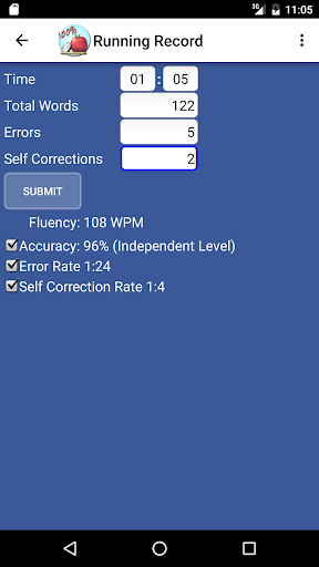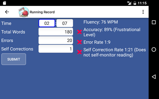 The running record calculator allows you to calculate the fluency in words per minute (WPM), accuracy percentage, error and self corrected rates. Teacher Tools includes graphic indicators to help you determine if student performance is on independent, instructional or frustration stage.
