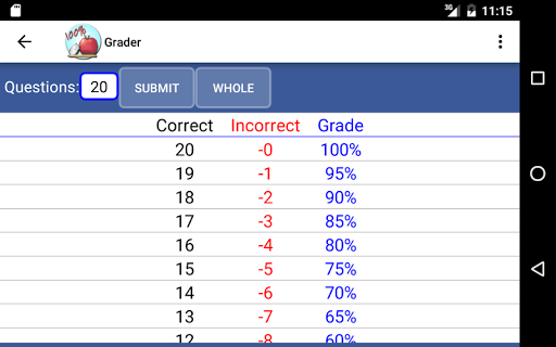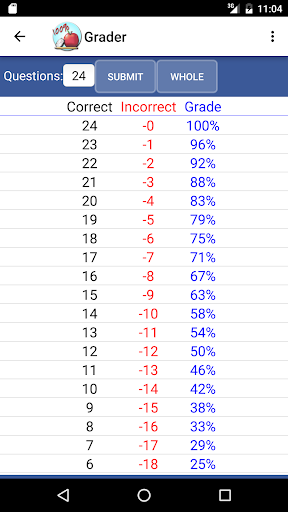 Once that you enter the total questions to grade, this calculator generates a table with the percentage grades according with correct and incorrect responses. It may also calculate for grading half points.