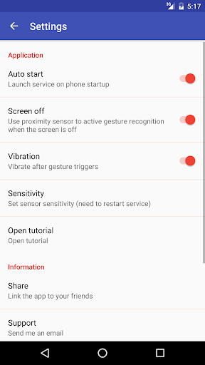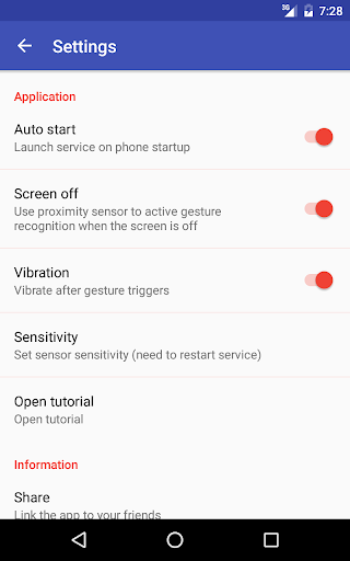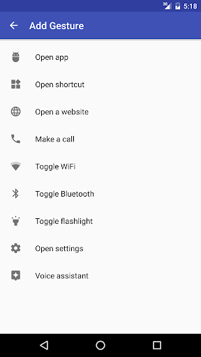 The interface is easy, friendly and follows the material design specification. You can add as many gesture as you want and delete them anytime with just a swipe.