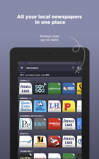 Newspapers are categorized and grouped for better navigation. In this way, you can read prensa libre and, from this one, you can move to other newspapers of the same category (soy 5o2 or guate vision) by moving up the lower menu. You are going to be able to compare how different newspapers analyze the same news. You can also find important regional newspapers such as diario de centro américa or canal antigua in the "Regional" category. We also have financial and political sections (you can read these news at plaza republica or estrategia y negocios) and, sports fans have guatefutbol and antorcha deportiva. Fashion magazines could not be missing to be updated on the latest trends, in aula, variety and amiga. You can read everything about with celebrities. Additionally for your convenience you can look through many other newspapers in each section.