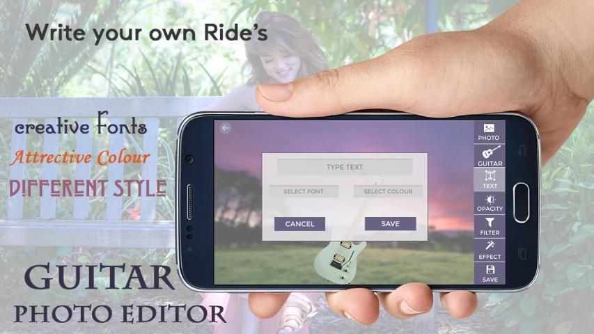 إضافة نص إلى خلقك. كما يوفر لك الغيتار محرر الصور نص محرر وظيفي كامل. إضافة نص على الصورة. تغيير لون النص، على غرار خط النص وغيرها الكثير. جعل الصورة الغيتار الخاص بك أكثر جاذبية.