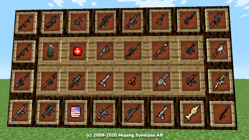 Guns mod for minecraft - is a big collection of addons which add 70 items to the game. In our collection of weapon mods for minecraft you will find more than 50 guns, different grenades 6 types of ammunition, there are pistols, shotguns, rifles, miniguns, and other equipments. Guns for minecraft comes with a custom user interface for each weapon and an advanced weapon system including things like ammunitions and unique crafting recipes for each weapon mod for mcpe.