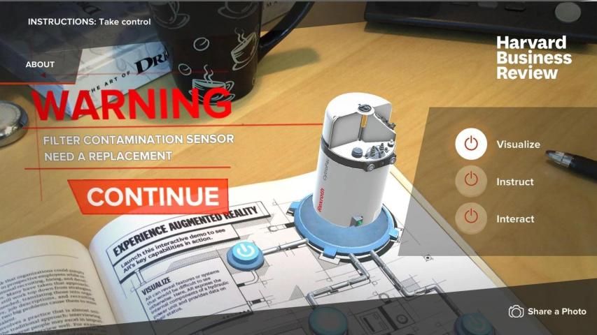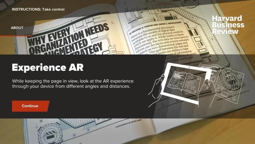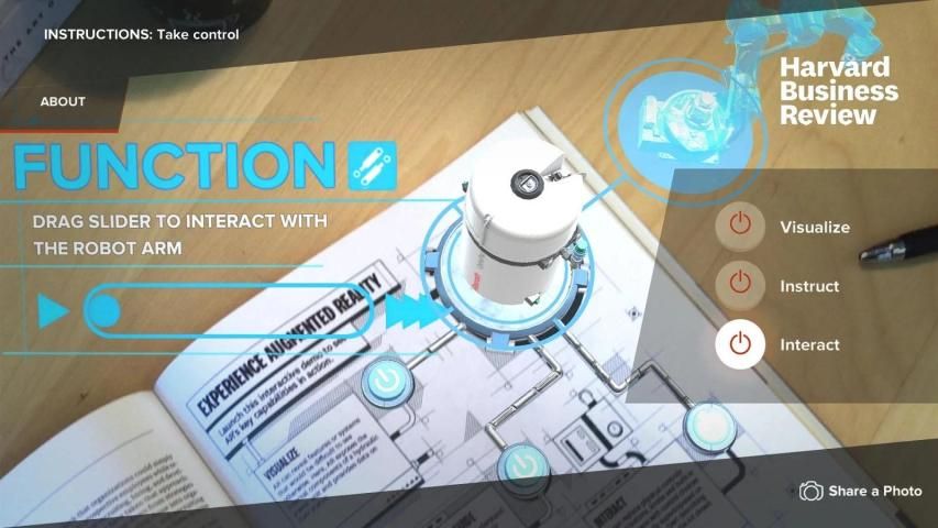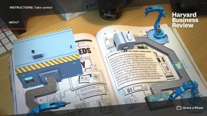 دمجها تجربة الواقع كما استكشاف المادة HBR نوفمبر-ديسمبر 2017 "لماذا يحتاج كل منظمة استراتيجية الواقع المعزز،" مايكل بورتر وجيمس هيبيلمان. ببساطة فتح المجلة إلى الرسوم التوضيحية تمكين AR المقال، يشير الجهاز المحمول الخاص بك، ومشاهدة الرسومات تأتي في الحياة. إذا لم يكن لديك المجلة، يمكنك تحميل المادة مباشرة من التطبيق. نقل والميل جهازك لمعرفة قدرات AR في العمل: مشاهدة وجهة نظر أشعة X متحركة وحدة الطاقة الهيدروليكية، انظر تعليمات خطوة بخطوة لإصلاح، والسيطرة على ذراع الروبوت مع شاشة اللمس.