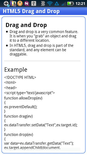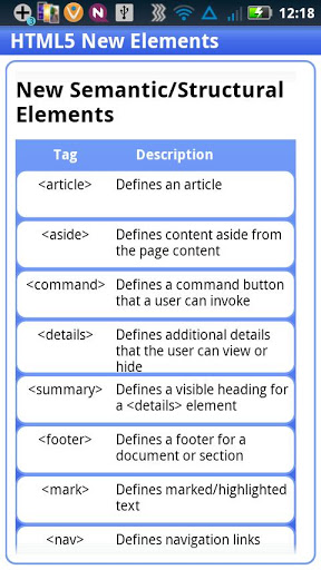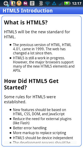 What is html ?HTML5 will be the new standard for HTML.The previous version of HTML, HTML 4.01, came in 1999. The web has changed a lot since then.HTML5 is still a work in progress. However, the major browsers support many of the new HTML5 elements and APIs.This application covers the basic concepts of Html5.Some of them are listed below:New ElementsNew AttributesFull CSS3 SupportVideo and audio 2D3D Graphicslocal StorageLocal SQL database Web Applications