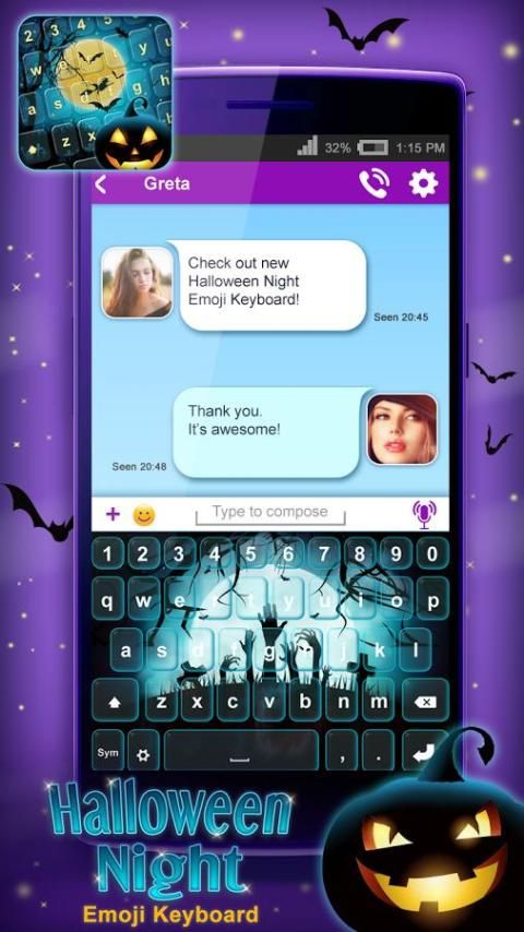 ❦ The adorable picture keyboard for texting will inspire you to text like never before. Our trendy app for boys and girls ❦ Halloween Night Emoji Keyboard ❦ is perfect for everybody who love to change keypad themes and skins frequently. Your smartphone will have the best costumes ever. Experience all the scary and fun Halloween moments right this instant on your tablet with the new and spooky keypad skin and be a real trendsetter among your friends. Decorate your keyboard with “Halloween decorations” and enjoy your favorite holiday with this cool theme. Pick up your beautiful images from the gallery and set one of them as your background for keyboard. Enjoy different keyboard decorations and type on awesome keypad buttons.