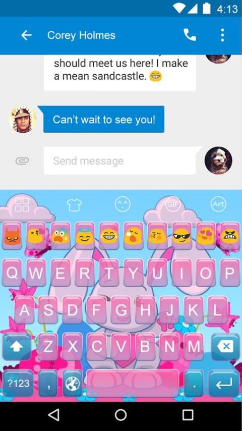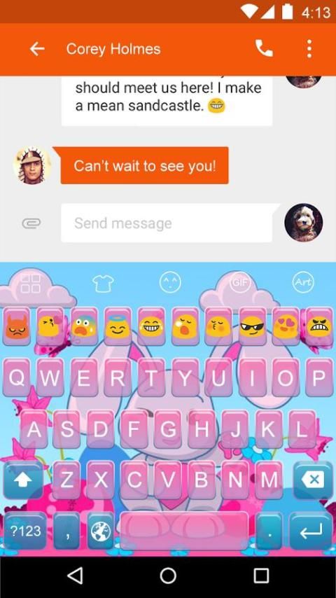 Lovely Happy Bunny Emoji Gif Video keyboard theme let your phone become unique and beautiful. There will feel more funny and easier for you chat with your friend in the SMS, whatsapp,facebook,twitter and etc via Lovely Emoji-Gif Video Keyboard.